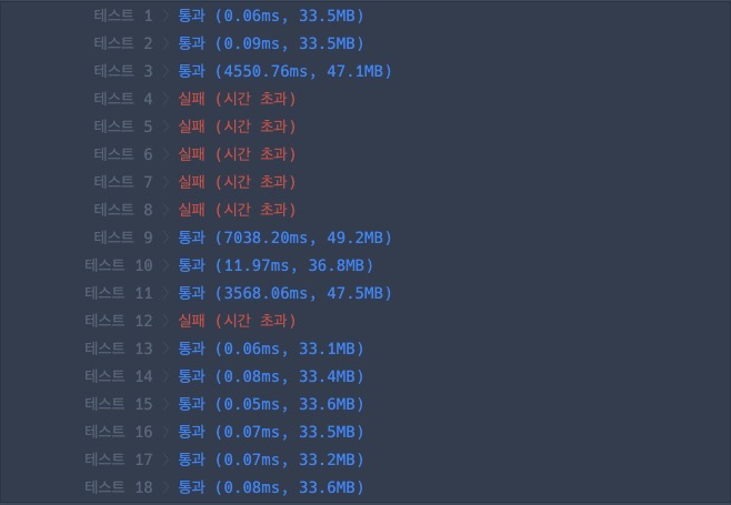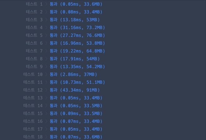 위 코드를 통해 모든 테스트 케이스들을 훨씬 빠른 속도로 통과할 수 있었다.