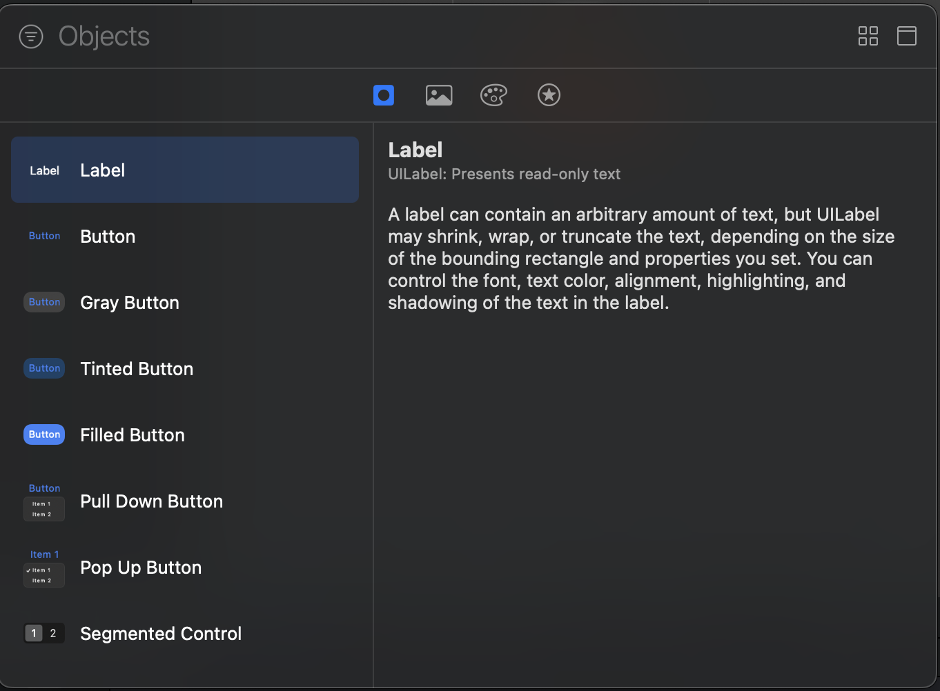 Xcode에서 Interface Builder가 나왔을 때 우측 상단 + 버튼을 누르면 아래와 같은 이미지가 나타난다.