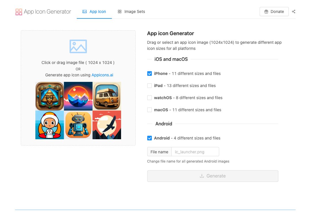 먼저 App Icon Generator에서 이미지를 추가하고, 원하는 환경의 설정을 체크한 후 파일을 생성한다.