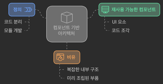 컴포넌트 기반 아키택처란 웹 개발에서 사용되는 개발 패턴으로, 애플리케이션에서 재사용이 가능한 컴포넌트 단위로 분리하여 개발하는 방식이다.
