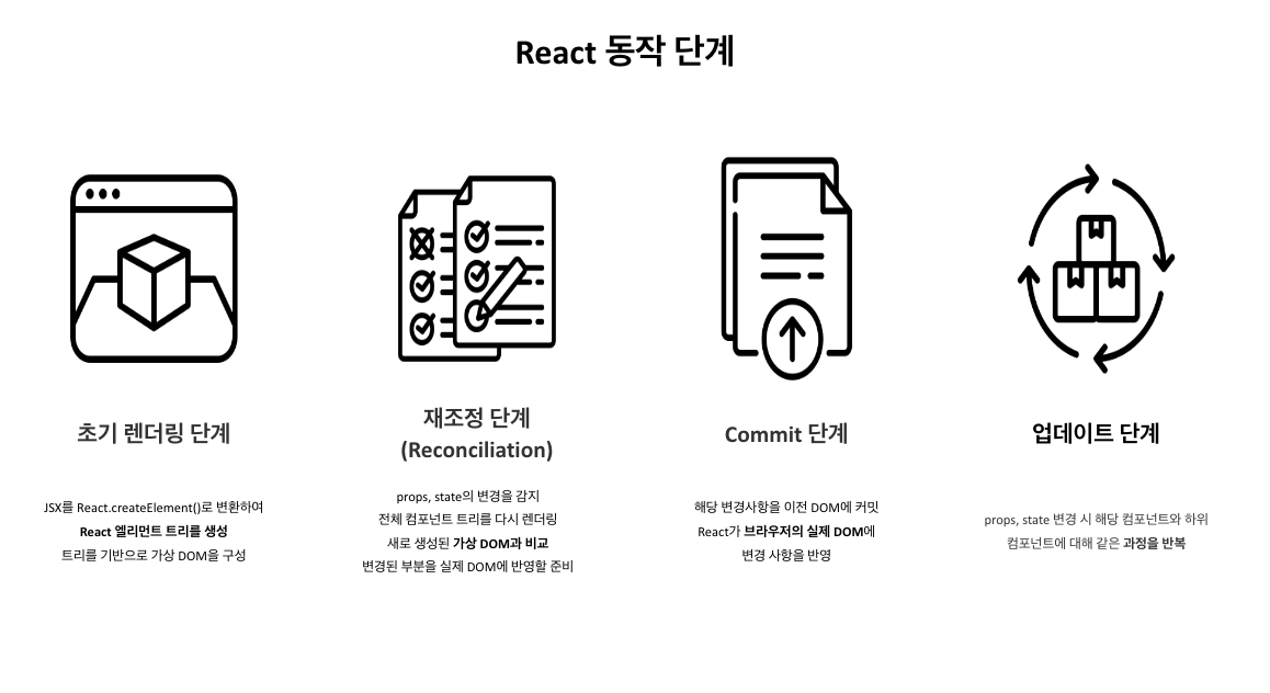 먼저 초기 렌더링 단계에서 리액트 엘리먼트 트리를 생성하고, 이를 기반으로 props 또는 상태의 변경을 감지하여 새로 생성된 가상 DOM과 비교한다. 이후 Commit 단계에서 브라우저의 실제 DOM에 변경 사항을 반영하고 이 과정을 반복한다.