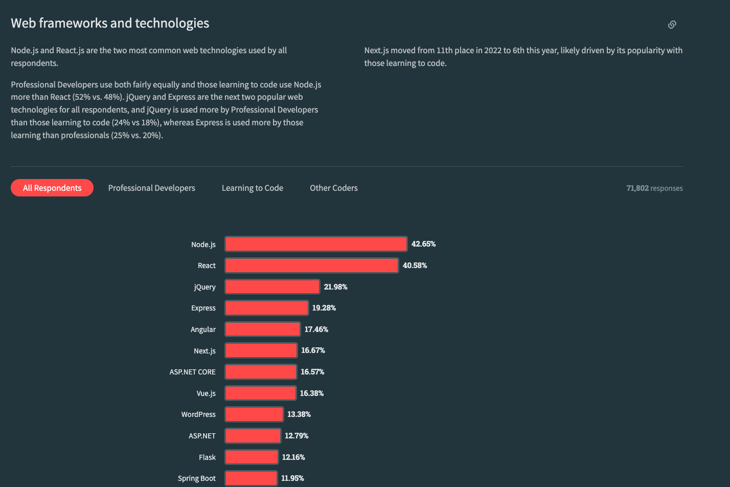 2023년에 스택오버플로우에서 개발자들을 대상으로 진행한 설문에서 "웹 프레임워크 및 기술" 부문에서 위와 같은 결과가 집계되었다. 웹 개발, 특히 프론트엔드 분야에서는 현재 가장 많이 사용되는 기술 스택이라고 보아도 될 것이다.