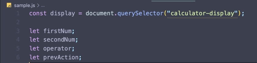 display같은 경우 .textContent 속성을 활용하기 위해 주어진 것으로 보였고, 네 변수는 임의로 그 값을 할당해 계산기의 사칙 연산을 해결하는 데 도움이 될 것처럼 보였다. 특히 prevAction 변수는 이전에 누른 버튼 이벤트(action)의 저장값으로 이벤트 핸들러 역할의 변수로 보였다.