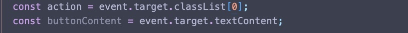 이벤트 리스너 내부에 주어진 변수는 미리 HTML태그에 부여한 각 클래스를 가져오는 변수와 현재 이벤트 타겟의 텍스트 컨텐츠를 가져오는 변수들이었다.