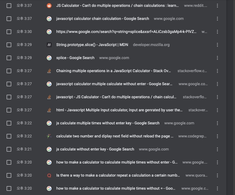 특히 마지막에 2시간 넘게 한 개의 테스트 케이스 때문에 계속 JS를 뜯어보고 고민해봐야했는데, 그 과정이 너무나도 고통스러웠다. 연산자를 연속해서 쓸 때 '계산' 버튼을 누르지 않아도 자체적으로 연산값을 누적해야 하는 것이 테스트 케이스가 확인하고자 하는 것으로 보였다.