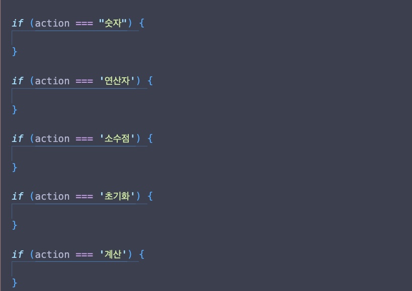 - 앞의 두 조건이 모두 만족되면 (secondNum 값이 할당이 되어 있고, prevAction이 "연산자"로 눌려있지 않을 때, 즉 숫자 버튼이 눌려있고 연산자가 새롭게 눌렸을 때) 기존의 숫자(fistNum)을 *[계산] 함수를 활용해 새로운 값으로 할당 *[계산(firstNum, operator, secondNum)]