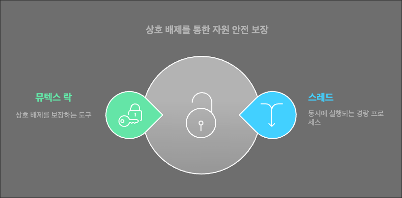 뮤텍스(Mutex)는 상호 배제(Mutual Exclusion)의 줄임말로 한 번에 오직 하나의 스레드(또는 프로세스)만 공유 자원에 접근할 수 있도록 하는 개념이다. 뮤텍스는 '자원에 접근하기 전, 반드시 뮤텍스를 획득해야 한다'는 규칙을 강제함으로써, 동시에 둘 이상의 스레드가 해당 자원을 변경하지 못하도록 한다.
