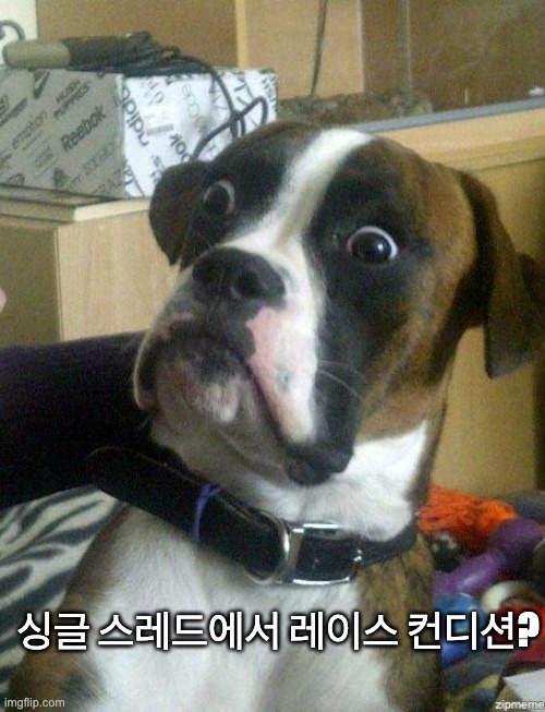이러한 상황, 즉 두 개 이상의 스레드(Thread, 프로세스를 구성하는 실행 흐름의 단위)나 프로세스가 공유 자원에 동시에 접근하여, 기대하지 않은 결과나 모호한 상태를 야기하는 상황을 레이스 컨디션(Race Condition) 이라고 한다.