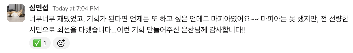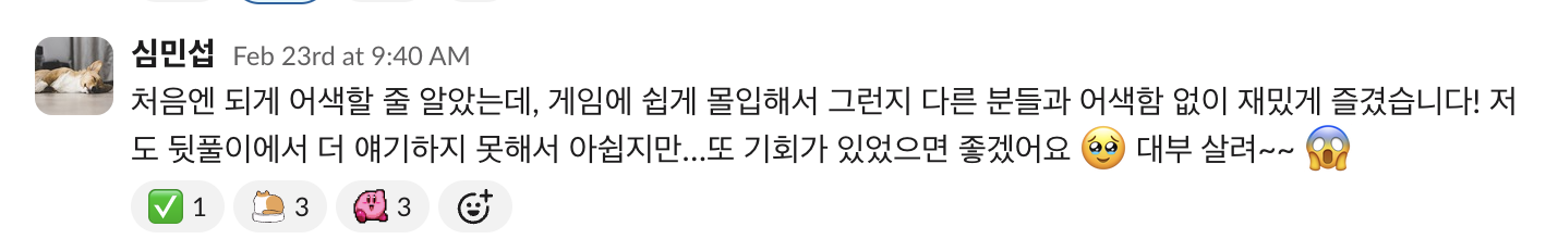 게임해또에서 많은 분들과 만나 같이 게임도 하고, 얘기하면서 커피챗에 대한 용기도 생긴 것 같다.