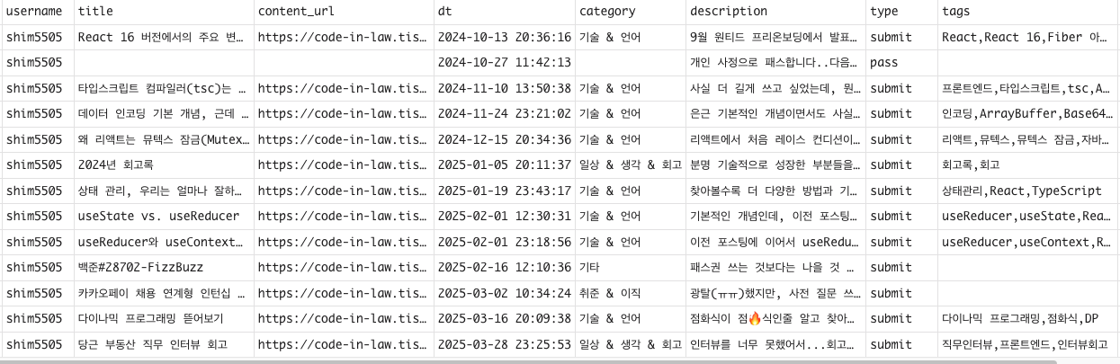 나는 이 중 11번의 회차 동안 총 12개의 글을 제출했고, 총 5번의 커피챗을 가졌다. 아마 글또의 전체적인 분포에서는 평균보다 조금 떨어지거나 딱 평균 정도이지 않을까 한다.
