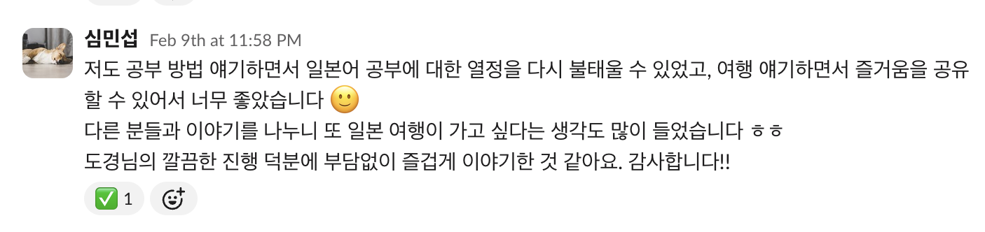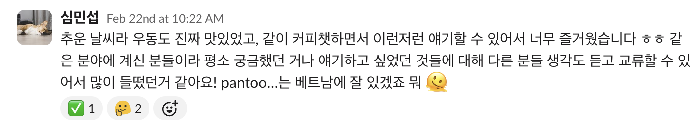 모임을 통해 만나게 되는 다양한 분들이 나의 개발자 삶에 새로운 활력과 영감을 주셨고, 거대한 개발자 세상에서 내가 그들의 일부로써 살아가고 있음을 느낄 수 있었다. 그리고, 이러한 확인이 매일매일 바쁘게 살아가는 우리 현대인에게 큰 도움이 되는 것 같다. 답답한 공기를 환기시키기 위해 세상과의 창을 여는 느낌이었다.