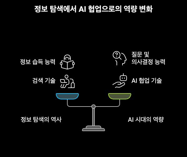 초기에는 도서관에서 정보를 찾았기 때문에 책의 정보를 잘 습득하고 기억하는 것이 중요했지만, 이후 검색 서비스가 발전하며 검색을 올바르게 하고 잘 찾아내는 것이 각광받는 능력이 되었다고 했다. 또한 이제는 AI 시대에서 질문을 잘하고 원하는 답변을 이끌어내는 것이 중요해졌으며, 나아가 AI 에이전트의 시대에서는 AI가 내게 질문했을 때 의사결정을 잘 내릴 수 있는 것이 중요해질 것이라고 했다.