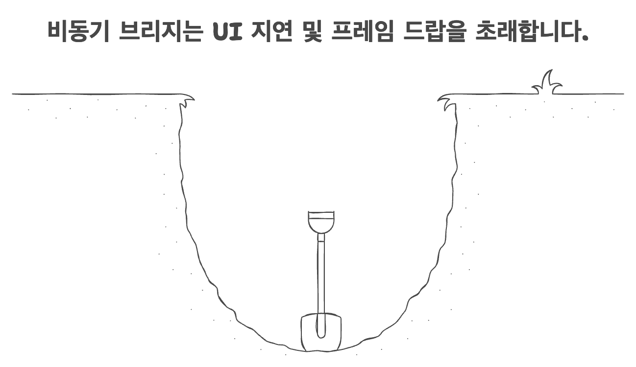 기존 아키텍처에서는 JS와 네이티브 코드 간의 데이터·이벤트 주고받기가 항상 비동기(Async) Bridge로만 처리되었다. RN이 처음 설계되었을 때에는 JS와 네이티브에 완전한 타입/메모리 일치를 보장하기 어려워 안전을 위해 브리지 큐에서 메시지 단위로만 통신하도록 설계했기 때문이다. 이로 인해 사용자가 스크롤·드래그·제스처 같은 민감한 UI 동작을 할 때, JS와 네이티브 간 실시간으로 바로 메시지를 주고받을 수 없고, 항상 큐에서 기다리며 처리되어 “미세하게 느린 느낌" 또는 "프레임 드랍”을 느낄 수 있었다.