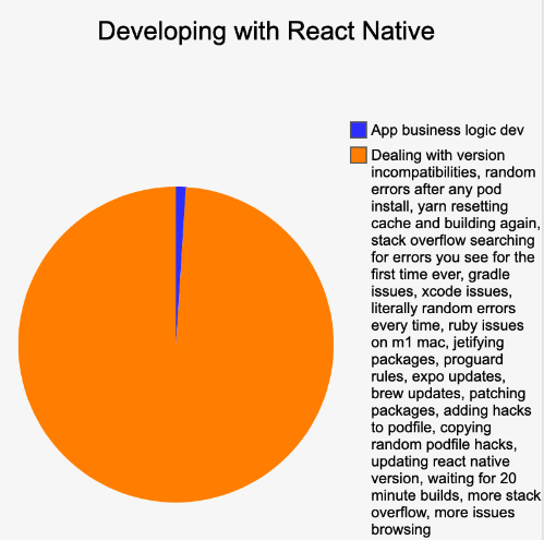 리액트 문법 기반으로 한 낮은 러닝 커브, 리액트 특유의 풍부한 생태계 상당 부분을 사용할 수 있는 유연함 등의 이유로 빠른 인력 투입 및 개발을 필요로 한 스타트업에서 많이 애용되고 있으며, 나 역시 실무에서 대부분의 앱 개발을 RN으로 진행했다.