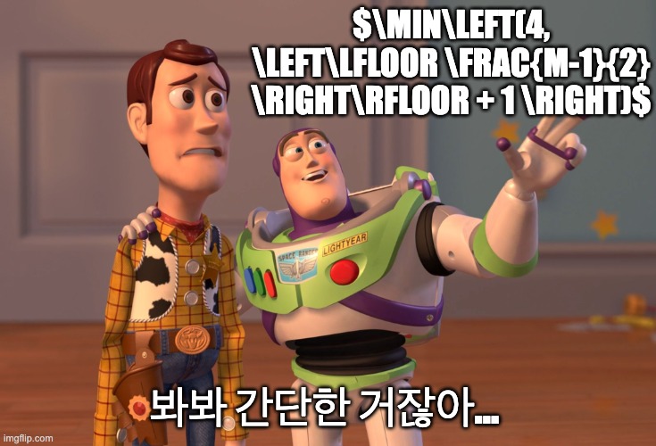 - 네 가지 이동 모두 가능 → 매 이동마다 오른쪽 진행 가능 → 최대 M-2 공식 → 네 번째 경우