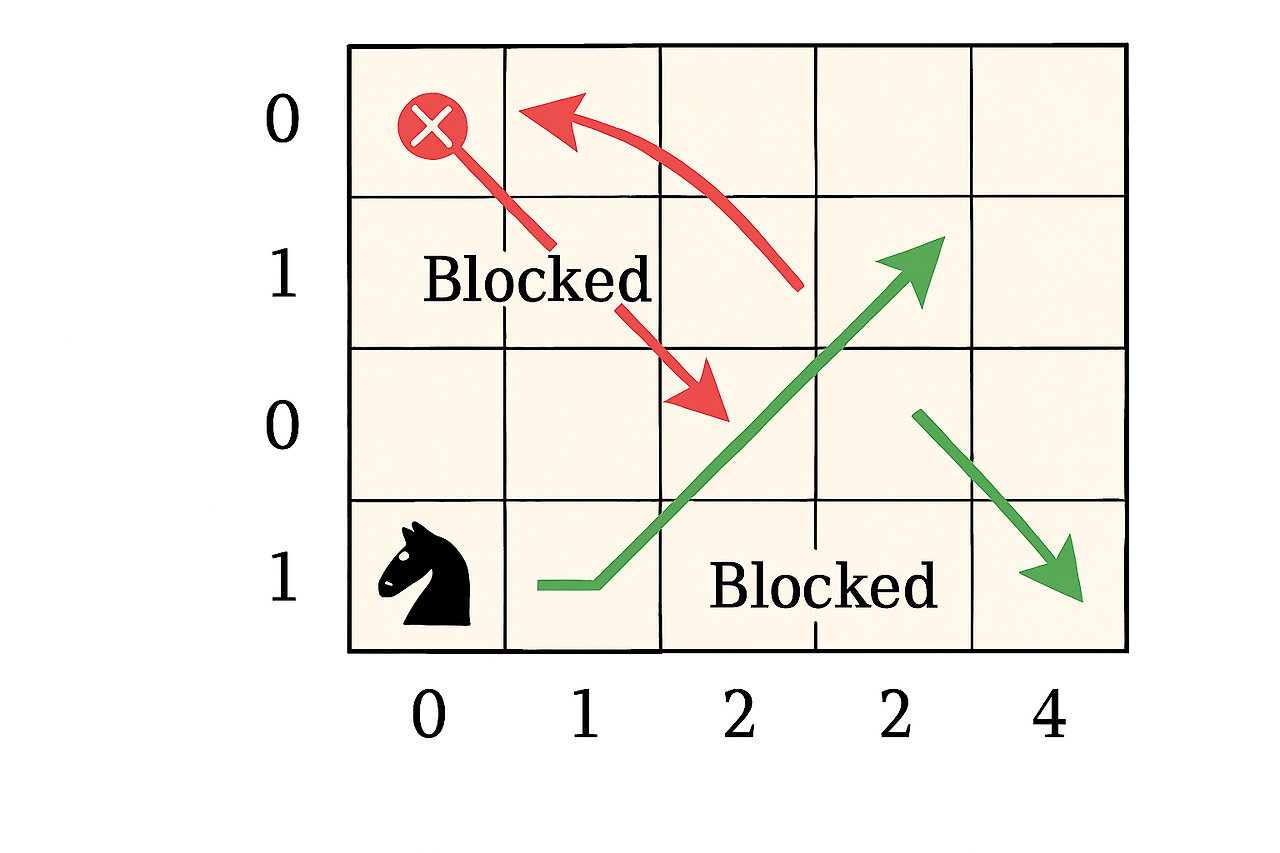 우선, 네 가지 방향 이동이 가능하지만 제한된 보드판 내에서 "최대 이동 칸 수"를 이동하기 때문에 DFS/BFS 기반 탐색이 아닌, 그리디로 풀어야 한다는 점을 알 수 있었다. 즉, knight_directions 또는 visited 기반으로 한 탐색은 필요 없다.