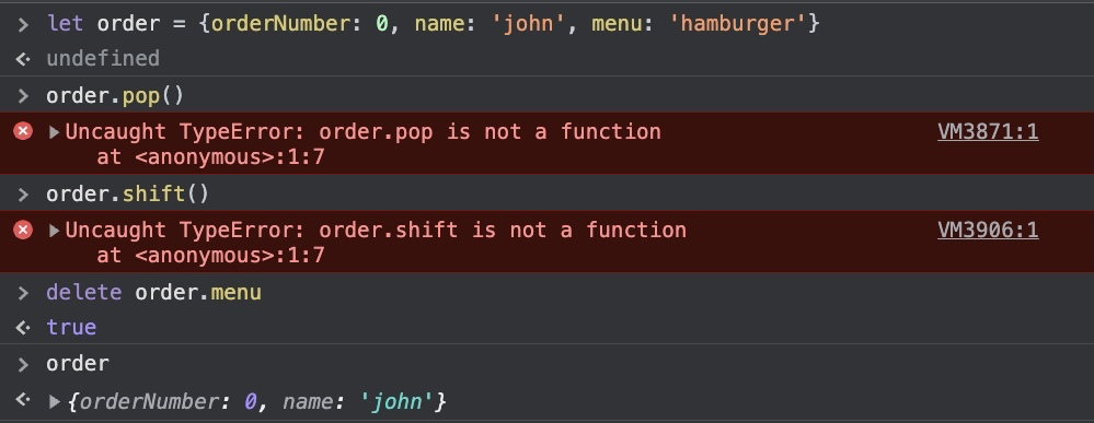 객체 자체에는 속성을 삭제하는 메서드가 없다. 또한 배열의 메서드를 활용할 수 없기 때문에 위와 같이 delete 연산자를 활용해야 객체의 자료를 삭제할 수 있다.