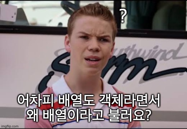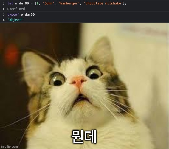 typeof를 썼더니 기대했던 'Array' 대신 'object'가 나왔다. 이건 무슨 소리일까? 말 그대로다. '배열'은 '객체object'의 한 종류다. 다만 배열의 경우 보통의 객체와는 다른 몇 가지 특이점을 가지고 있기 때문에 통상적으로 객체에 포함하지 않고 별개의 존재로서 구분한다. 그렇다고 배열이 객체가 아닌 것은 아니므로 헷갈리지 말자. 우리는 typeof 연산자를 통해 물어봤기 때문에 컴퓨터는 이해한 그대로 '배열'이란 자료형의 구분을 알려준 것이니, 콘솔창의 결과값이 틀린 것이 전혀 아니다. 그렇다면 객체는 무엇일까?