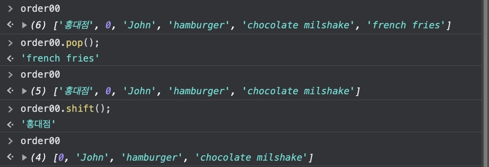 앞의 예시와 마찬가지로 배열 끝에서부터 항목을 제거하고 싶으면 .pop() 메서드를, 배열의 앞에서부터 항목을 제거하기 위해서는 .shift() 메서드를 활용해 값을 없애주면 된다. 앞의 항목 추가 메서드와 다르게 삭제 메서드는 삭제된 해당 항목을 return값으로 가지므로 이를 적절히 활용해 어떤 값이 삭제됐는지 확인할 수 있다.