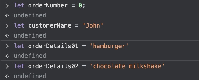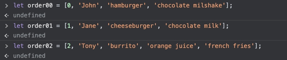 이처럼 배열은 각각의 연관성이 있는 자료들을 한 곳에 묶어 보관하는데 유용하다. 덕분에 우리는 각각의 변수를 각각 선언하고 값을 할당하지 않아도 order라는 큰 틀 안에 모든 자료들을 저장할 수 있다. 또, 여러 개의 자료를 한꺼번에 보관하고 있기 때문에 개발자 입장에서 자료에 접근하기 좀 더 용이하고 기억하기도 쉽다. 한 가지 주의할 점은 배열의 순서는 0부터 시작하기 때문에 첫 번째 자료는 [0]번째 인덱스에 저장된다는 사실을 인지하고 있어야 한다.
