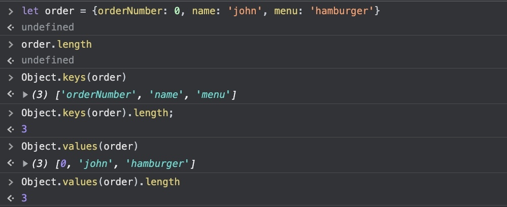 객체의 길이를 구하고 싶다면 먼저 기존에 객체 안에 포함되어 있던 키와 값을 분리해야 한다. (객체가 성립되기 위해선 키와 값이 쌍을 이루어 있기 때문) 따라서 Object.keys 또는 Object.values를 활용해 해당 객체의 키 또는 값을 배열로 받고 해당 배열의 길이를 구함으로서 객체의 "길이"를 구할 수 있다.