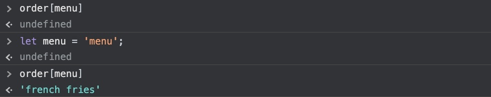 단, 위처럼 별도의 변수를 선언하고 할당해, 변수값과 객체 안의 키가 같다면 이를 활용해 객체 안의 키와 일치하는 값을 불러올 수도 있다.