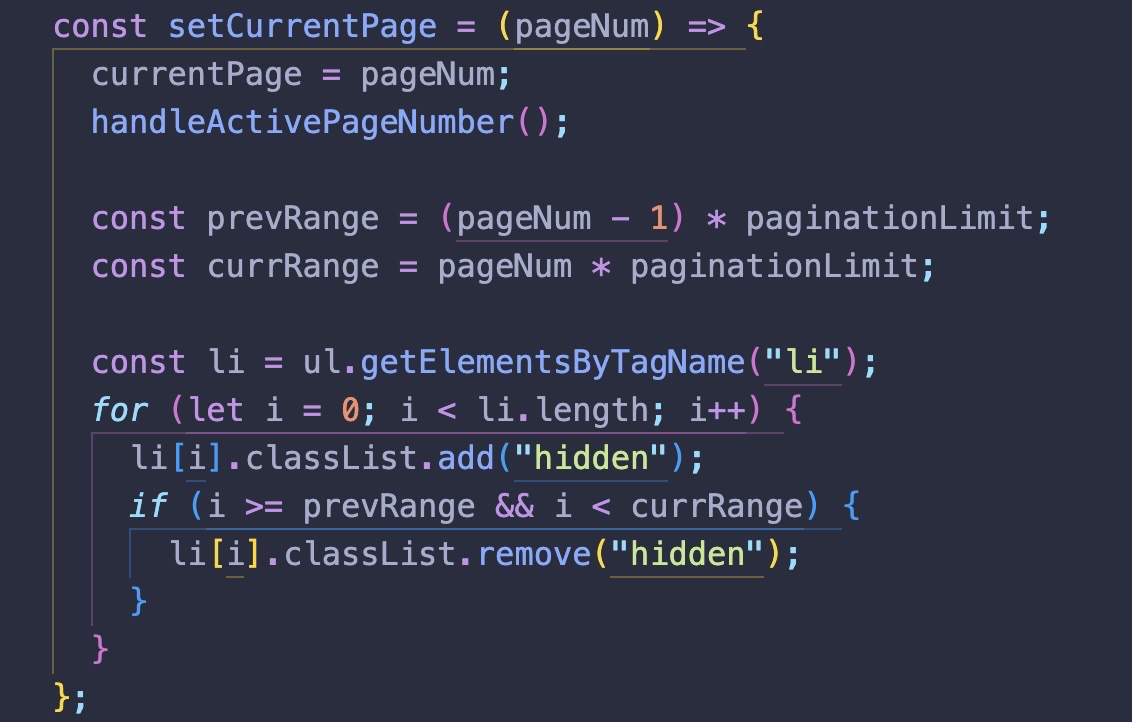 페이지네이션 기능 구현 중 가장 시간 소모가 컸던 부분은 render 기능과 따로 모든 자료형에 'hidden'이라는 클래스명을 추가하는 부분이었다. 기본적으로 ul 태그를 사용했기 때문에 classList.add()기능을 구현할 수 없었다.