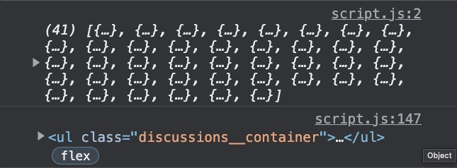 전체적인 구조를 돌아보고 이해한 후에서야 JS파일에서 기능 구현을 시작하려 했는데, data.js파일(제공된 데이터 소스로, DB에서 데이터를 가져온 JSON 구조와 유사하다고 생각했다)의 배열 'agoraStatesDiscussion'이 어떤 형식의 객체를 포함하고 있는지 확인이 필요했다. 해당 파일을 둘러본 후에야 마침내 기능 구현을 시작할 수 있었고, TODO 주석에 적혀 있는 힌트들이 이해가 잘 되었다.