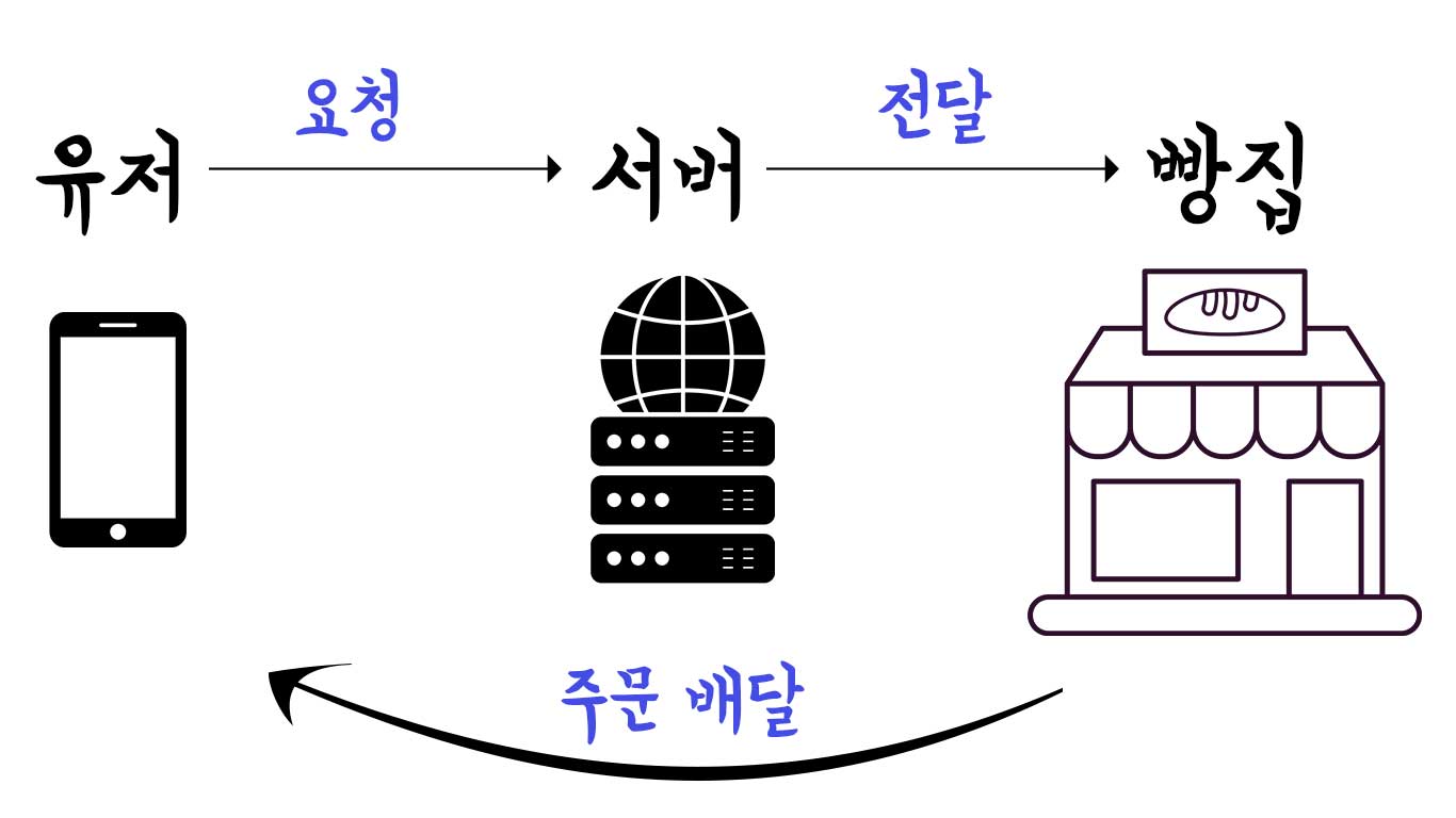 서버는 내게 빵을 직접 주지는 않지만, 나의 "요청"을 배달 애플리케이션의 서버를 통해 "전달"받은 해당 빵집은 나의 요구를 확인하고 배달을 통해 내가 애플리케이션에 작성한 집 주소로 빵을 배달시켜준다.