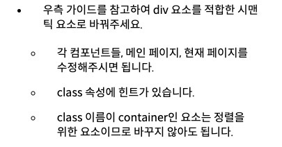먼저 기본적으로 제공되었던 코드들을 시맨틱하게 변경시켜주고, css 스타일링을 전체 구조에 맞게 바꾸는 부분이었는데 무엇을 정확히 어떻게 바꾸는지 이해하지 못했다.