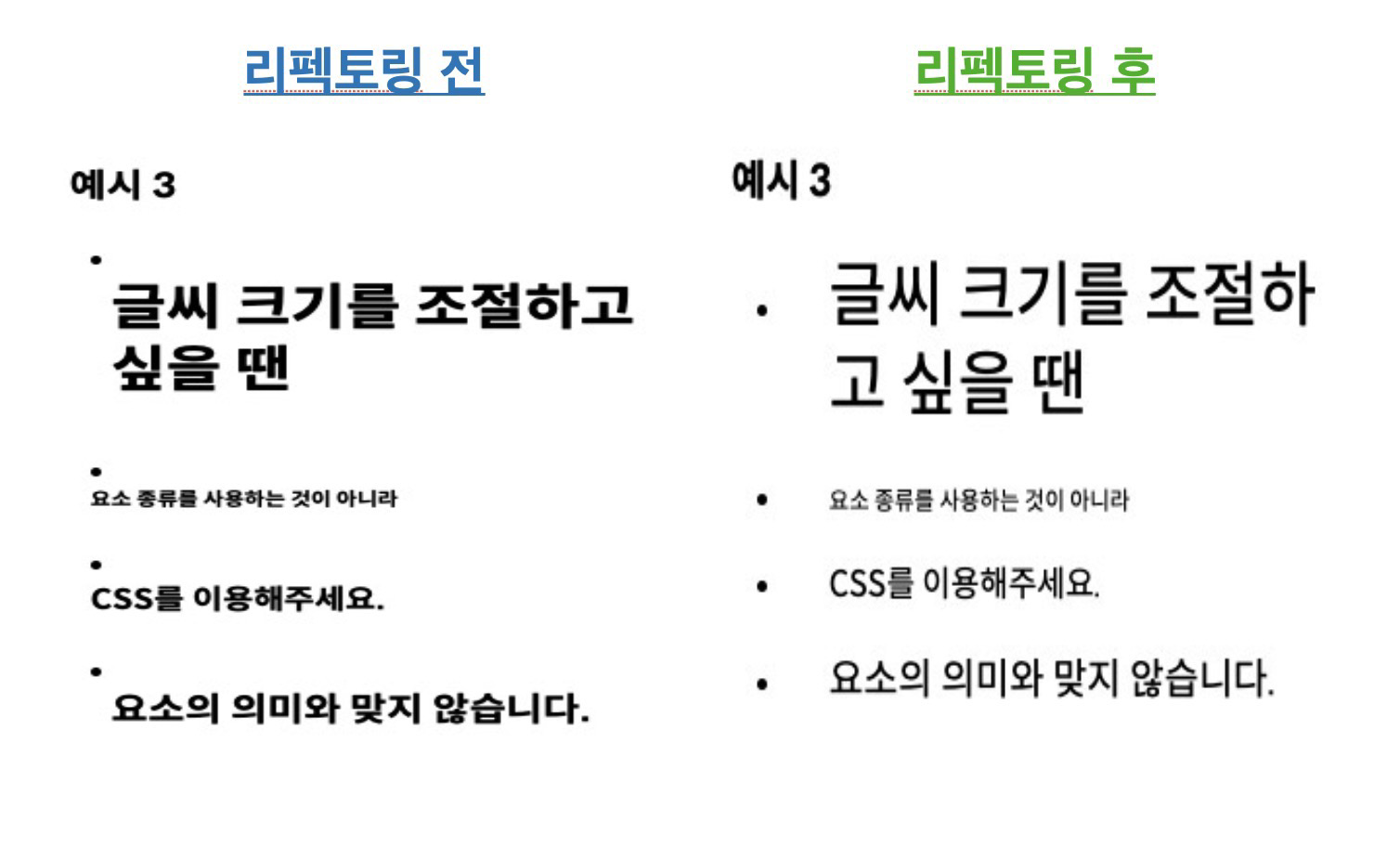 이후에도 개별 css 스타일링을 적용해야 했는데, "리펙토링"이라는 단어를 너무 의식했던 것 같다. 스타일을 기존 스타일과 동일하게 구현하고 싶었는데, 약간씩 오차가 발생해 과제가 요구하는 내용과 다르다고 생각했는데...알고보니 그냥 "적당히" 스타일이 비슷하면 됐다.