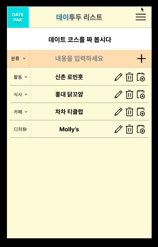 내가 만들고자 하는 애플리케이션은 To-Do 리스트 앱의 기본적인 기능을 유지한 "데이트 To-Do 리스트"였다. 앱의 목표는 To-Do 리스트와 동일하지만 데이트를 위해 사전에 계획하고 정리할 수 있는 기능을 만들고자 했다. To-Do 리스트의 강점인 체크박스를 통한 시각적인 피드백이 온전히 사용되지 않은 점이 조금 아쉬웠다.