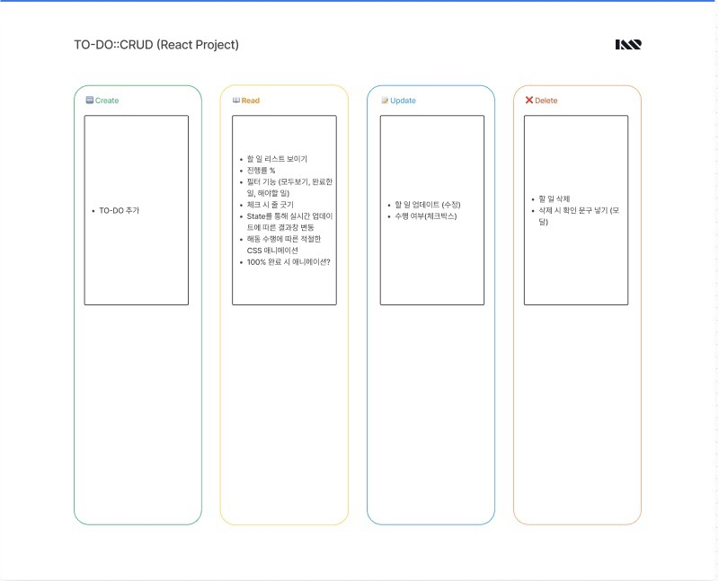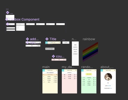 먼저 기본적인 요구 사항에 따른 CRUD가 무엇이 있는지 적어보았다. 여기에 다른 To-Do 리스트 앱과 차별점을 줄 수 있는 것을 생각해보고, 그에 따라 가중되는 요구 사항이 무엇인지도 정리했다. 기본적인 CRUD 기능을 벗어나지 않고, 두 세트 이상의 CRUD 기능을 만들지 않는다는 판단이 되어 기본적인 브레인스토밍을 마치고 디자인 단계로 넘어갔다.