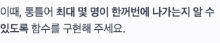 큐 자료구조를 활용한 문제의 마지막 문장이다. 문제가 요구한 부분은 큐의 자료구조를 활용해 "나갈 수 있는 인원들을 큐 별로 비교해" 최대 몇 명이 한꺼번에 나갈 수 있는지 확인하는 문장이었는데, 너무 쉽게 생각해 "여러가지 가능성 중 하나"가 아닌 "맨 처음 요소를 기준"으로 나갈 수 있는 최대 인원 수를 고려했었다.