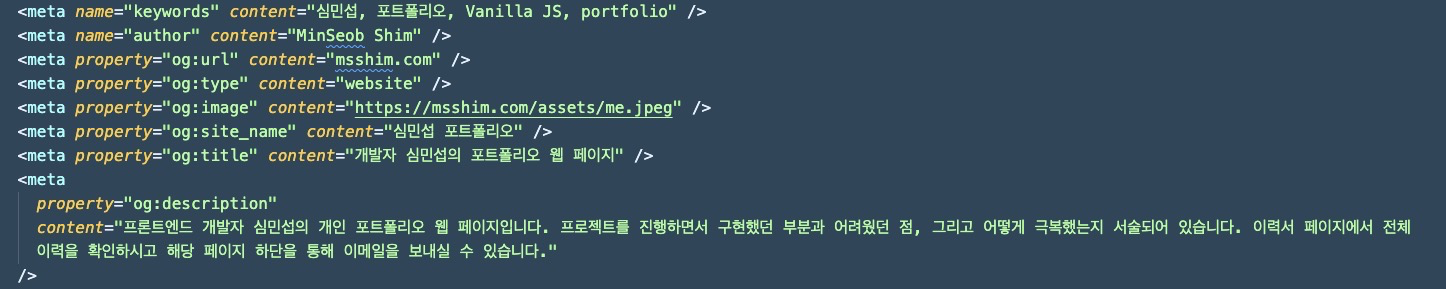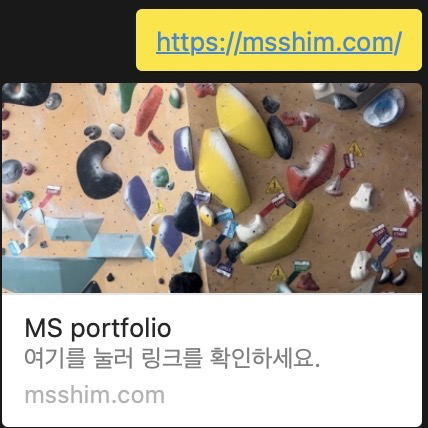 내 웹 페이지를 예를 들어보자면, 내가 og:image로 사용할 이미지는 assets/me.jpeg였다. 이를 토대로 msshim.com/assets/me.jpeg링크를 content 속성에 입력하면 해결할 수 있는 아주 간단한 문제(..)였다.