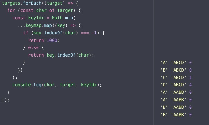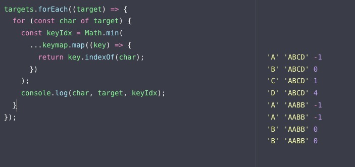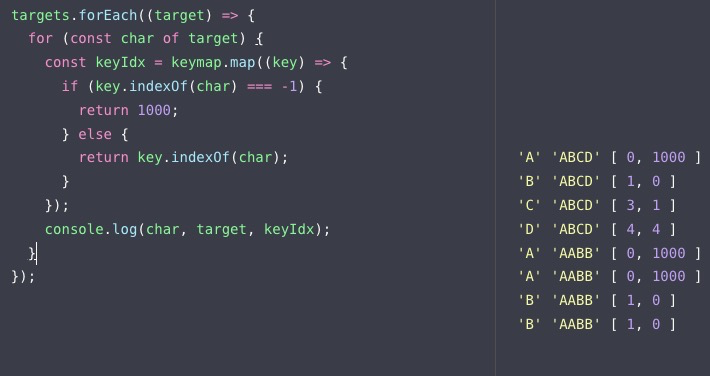 이전 단계로 돌아와서, 만약 인덱스 값이 문자열 내에 존재하지 않는다면 (key.indexOf(char)이 -1 값이라면) 큰 수 1000을 반환해 더 작은 값을 가져오도록 로직을 수정했다. 숫자 1000을 반환하는 이유는 제한 사항에서 "target의 원소의 길이가 1 ~ 100 사이"라고 했기 때문에 100보다 더 큰 수, 안전하게 1000을 설정했다.