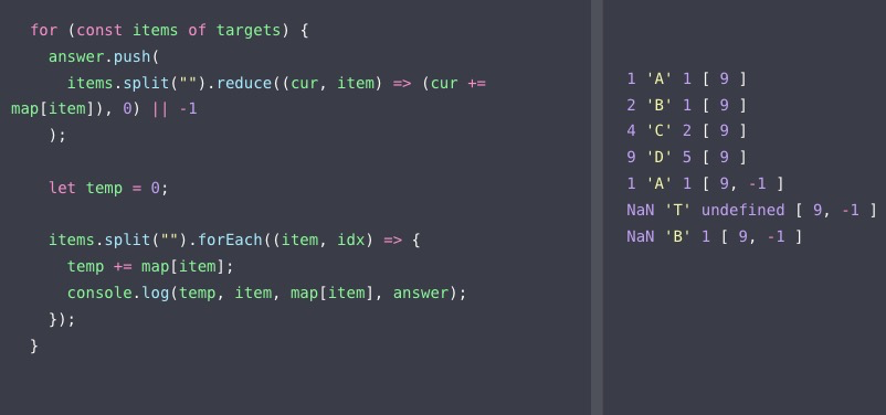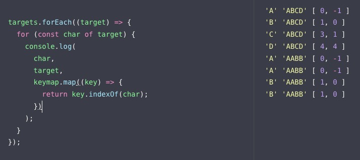 3) targets 배열을 순회, 이 때 각 문자열의 문자를 1)과 같이 순회, 미리 저장된 map 객체 내의 문자(키)로 지정된 값을 확인