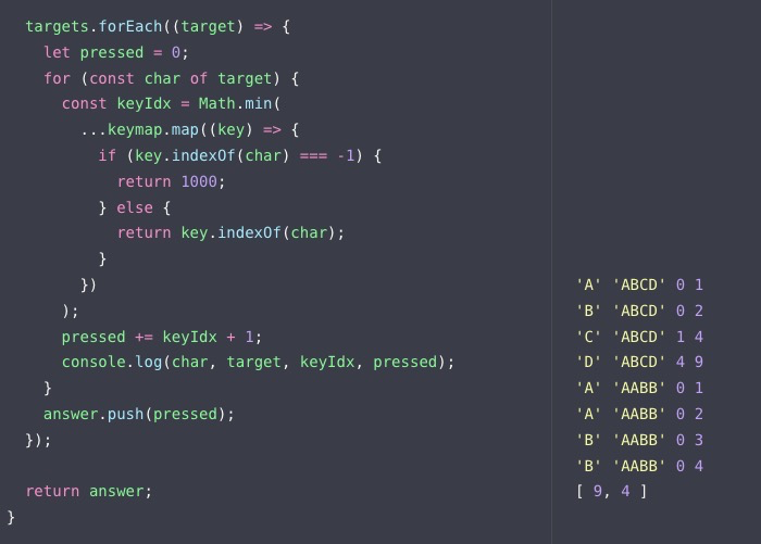 1번 키부터 차례대로 할당된 문자들이 순서대로 담긴 문자열배열 keymap과 입력하려는 문자열들이 담긴 문자열 배열 targets가 주어질 때, 각 문자열을 작성하기 위해 키를 최소 몇 번씩 눌러야 하는지 순서대로 배열에 담아 return 하는 solution 함수를 완성해 주세요.