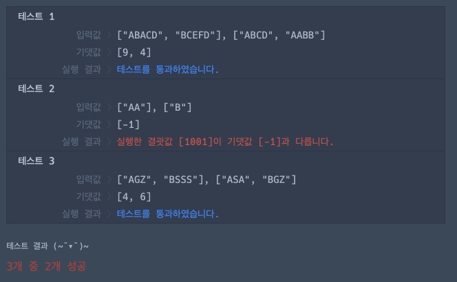 | ["ABACD", "BCEFD"] | ["ABCD","AABB"] | [9, 4] |