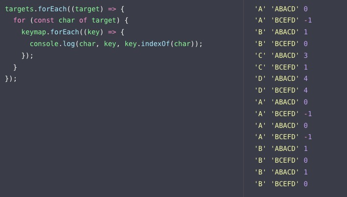 위를 통해 각 문자열의 영어 알파벳 당 매개변수 target의 문자열 개수만큼의 indexOf값을 받고 있음을 알 수 있었다. 따라서 해당 값들을 묶어서 비교할 필요가 있었는데, 이를 위해 비교군 역할을 할 배열을 순회마다 반환하는 .map() 함수를 활용해야겠다는 생각이 들었다.